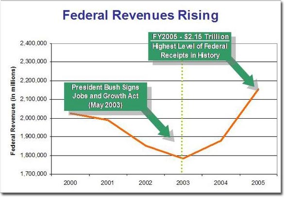 The law that enacted the Bush tax cuts was the Jobs and Growth Act of 2003. If you are a Democrat you know revenues declined, they had to, but you don’t know by how much. Here is the Bush record.