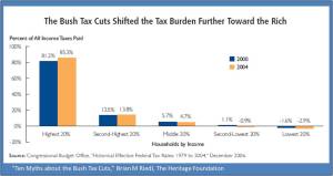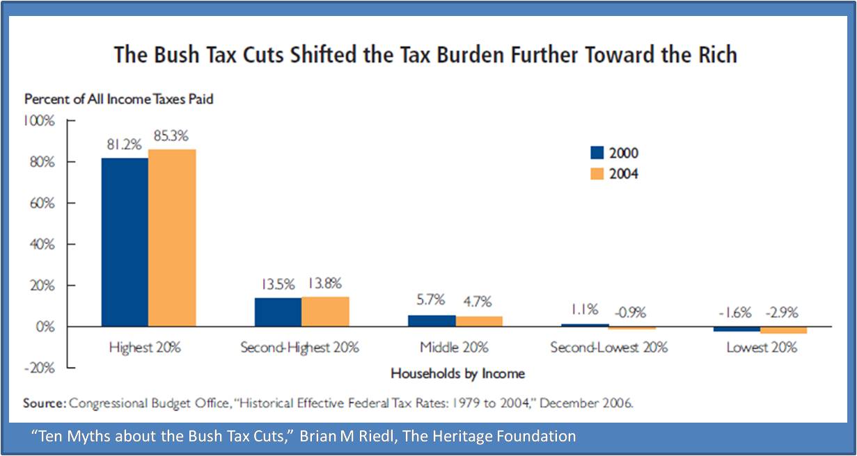 Those tax cuts shifted the distribution of the burden between the rich and not rich, (not between the rich and the poor because the poor pay nothing). If you are a Democrat you believe the burden was lessened on the rich. In fact it was increased by 4%. Here is the Bush record.