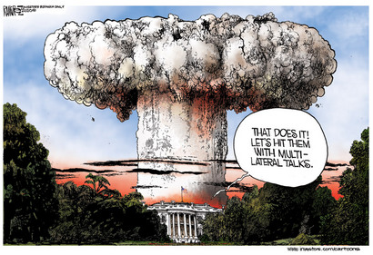 It appears Kim Jong Il wants another reward from the United States for stopping an aggression he started. Obama says we should talk. Ramirez captures the spirit of U.S. policy. If they bomb us, we will not stand by idle. We will prepare some tea and insist on a chat with them about it.
